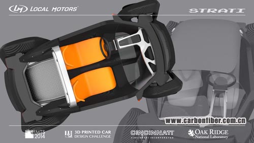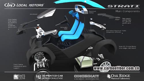 Local Motors方面表示,Strati汽車所用的碳纖維復合材料由Sabic創新業務部獨家提供。該新型3D打印汽車全身由40個部件組成。其中,13-20%為碳纖維增強型復合材料,87-80%為ABS樹脂。