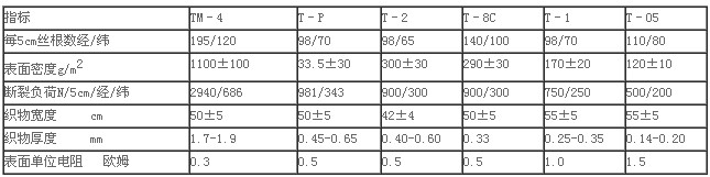 石墨碳纖維可以織成斜紋、平紋、緞紋等不同組織的織物,光明山“化纖”生產“烏拉爾”系列石墨碳纖維織物,品種有TM–4、T–P等6個,灰分含量0.5%,回潮率不大于1.0%,技術指標見表1。