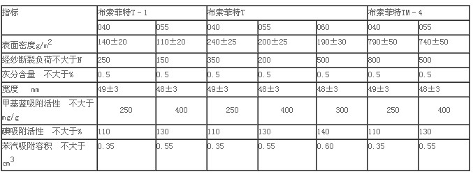 粘膠活性碳纖維有很強的吸附性,遠遠勝過活性碳。光明山“化纖”的活性碳纖維技術指標如下:單纖直徑6–10微米,比表面積700–2000 m2/g,吸附孔容積0.3–0.9cm3/g,單位電阻0.02–2歐姆.cm。用粘膠技術絲碳化–活化之后制成碳纖維吸附過濾材料,名叫“布索菲特”,分為條子,織物,非織造物,其中織物有3種,厚度0.2–1.5mm。技術指標見表2。可以將布索菲特T–1和T各兩層,組成TM–4,即四層材料。布索菲特吸附過濾材料用于吸附廢水、污水中的有機有毒物質,用于封閉系統內的空氣凈化,個人防毒吸附裝置等。