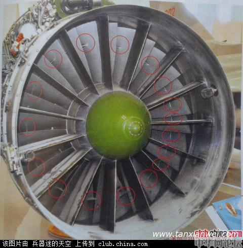 因此,有些風扇就在每個葉片的兩側加一個凸臺,專業術語稱為“凸肩”。建國60周年空軍成就展上披露,在殲11系列的AL31FN和WS-10A發動機進氣口,都有這樣的凸肩(見下圖)。這樣,葉片全部高速旋轉時,各凸肩形連起來成了一個加強環,增加了葉片剛度。而且,葉片是依次疊加的,每個凸肩“頂”著前面一個葉片,有效降低了阻尼震顫。但這樣做的后果,是凸肩增加了葉片厚度和重量,同時增加了葉片數量,降低了發動機的推重比。