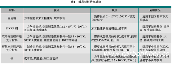 對于機身、翼面、舵面等大尺寸、大曲率的模具,通常選擇INVAR鋼,對于一些配合要求高的梁、肋、長桁等也常選擇INVAR鋼;對于鋪絲需要回轉(zhuǎn)的工 裝,考慮到重量因素,復(fù)合材料模具是一個不錯的選擇;對于形狀不是太復(fù)雜、曲率很小或是等截面的制件結(jié)構(gòu),通常選擇普通鋼或鋁以降低成本,但膨脹和變形因 素需要在設(shè)計時得到補償。不同模具材料的性能特點及使用范圍如表1所示。