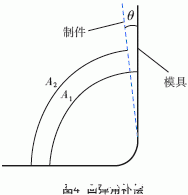除模具的膨脹對制件固化變形有影響外,復(fù)合材料制件因為鋪層和結(jié)構(gòu)的不對稱性,以及材料本身的固化特性,在固化時產(chǎn)生內(nèi)應(yīng)力也將引起制件變形。而對于梁、長桁類有大夾角的零件,固化變形最顯著的是回彈角,即制件在固化脫模后,夾角因收縮而小于模具角度,此差值為回彈角。如圖4所示,A1為模具夾角,A2為制件脫模后的夾角,θ為二者之差,即回彈角。在設(shè)計時,不考慮回彈角或考慮不當(dāng),將對制件質(zhì)量產(chǎn)生較大影響,特別是對裝配的影響。 123,123