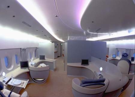 空中客車A380的機艙配備了為客機研發的最先進的機上娛樂系統,光纖配電網絡使電影、視頻游戲和電視節目的選擇更加靈活完備。在飛機上乘客還 可以使用便攜式計算機和打電話。有更多的開放空間,比如商務中心。底艙可選擇為設置休息區、商務區、酒吧或其它的娛樂區,按照不同航空公司的需求,還可安 排其它設施,如理發店、臥鋪、賭場、按摩室或兒童游戲場。寬大的空間可供頭等艙內安排私人套間,甚至包括淋浴設施的浴室。 123456