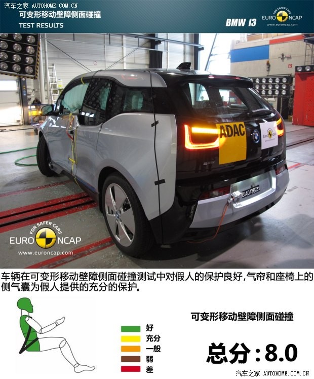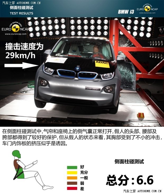 側面柱碰測試對于寶馬i3來說,不僅是檢驗車輛對駕駛員的保護能力,另一方面,車身結構對平鋪在車底的電池總成的保護也是一個考驗,但遺憾的是,E-NCAP的碰撞試驗沒有對此進行特別的說明,在未來,針對新能源汽車的碰撞測試中,這一環節是需要完善的。
