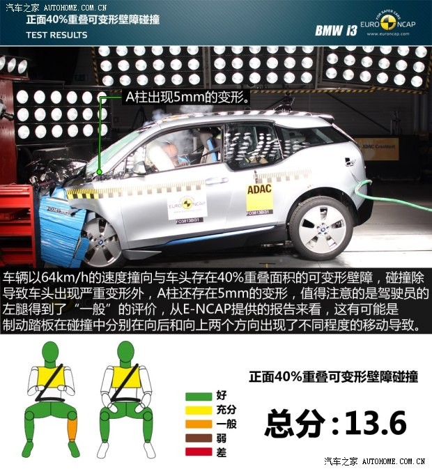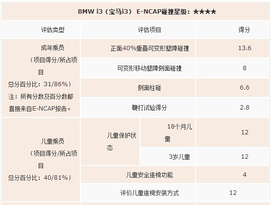 寶馬i3之所只拿到四星的成績,很大程度上都是因為這款車在行人保護和主動安全系統兩項評估失分較多,其中,行人保護測試中針對骨盆的評價和主動安全系統測試中有關速度輔助系統的評估都沒有得分,這導致兩項測試的得分均只拿到總分的一半。