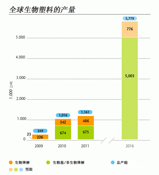 基于可再生原材料的塑料產量已經有了快速的提升,雖然其總體水平相對于石油基塑料來說還比較低。據制造商協會European Bioplastics報道,2009年,生物降解塑料的產量大約有幾十萬噸,占生物塑料全球總產能的絕大部分份額。但是自2010年以來,生物基塑料的增長速度已經遠遠超過生物降解塑料。據該協會預測,盡管生物降解塑料的產量在不斷增長,但到2016年,它們大約只能占到生物塑料總產量的七分之一。生物塑料中絕大部分將是生物基塑料,而不是生物降解塑料。 123456