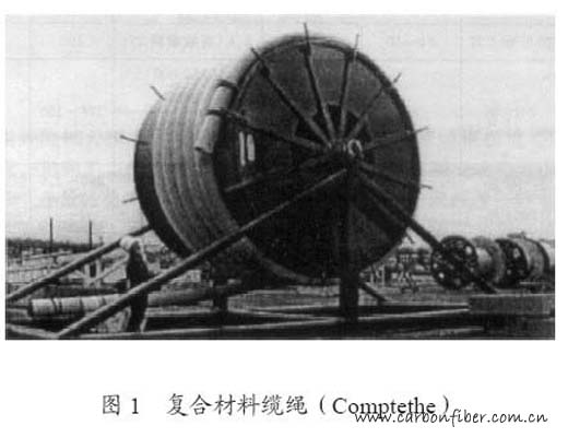 例如,一個(gè)深海1 500 m的作業(yè)平臺(tái),用鋼制纜繩(tether)約為6 500 t,用CFRP纜繩(Compteter)僅為1 000 t。同時(shí),前者最大深度只能到1 500 m左右,而后者可用到3 000 m的深海油田。此外,復(fù)合材料纜繩可卷繞到直徑為4.4 m的芯軸上,運(yùn)輸和作業(yè)非常方便。圖1是復(fù)合材料纜繩,圖2是準(zhǔn)備在海面安裝的復(fù)合材料管材。