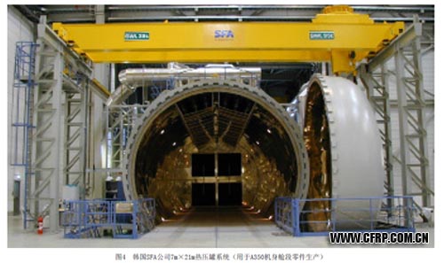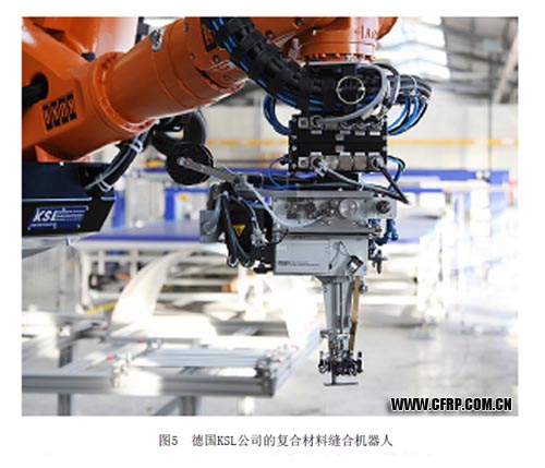 除自動鋪絲/鋪帶機外,其他一些先進的復合材料自動化加工設備也廣泛應用于波音和空客等主要飛機制造廠商的最新型號生產中。在復合材料固化方面,承接空客A350機身零件生產任務的德國Premium Aerotech公司采購兩臺韓國SFA公司(原英國Aeroform)公司制造的工作直徑為7m,工作長度為21m的巨型軸流式熱壓罐用于A350前機身13~14號艙段和后機身16~18號艙段的生產(圖4),由于采用沿熱壓罐長度方向排布的自動控制加熱功率的加熱元件和先進的基于“動態熱位差”控制原理的自動控制軟件,罐內溫度均勻性和生產效率都得到提高,從而最大限度地保證了A350項目的流暢性。模壓成形方面,波音787的翼梁生產中使用了西班牙SENER公司的裝備自動裝卸模具裝置的熱隔膜成形機生產C形梁,并使用同一家公司生產的復合材料自動拉擠成形機生產用于填補兩C形梁之間三角區的材料。在復合材料縫合和編織方面,空客A380巨型客機的后機身承壓隔框的生產中,德國KSL公司提供的自動縫合機器人將多層多軸向碳布進行縫合(圖5)[3],以保證各層碳布之間的連接,然后利用先進RFI(樹脂膜熔塑)技術進行樹脂浸潤、固化并得到零件[4]。