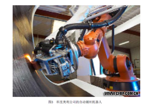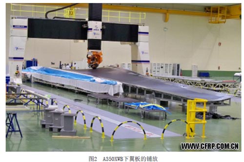自動鋪帶機和自動鋪絲機的迅猛發展為復合材料在在飛機主要結構件生產中的大范圍應用鋪平了道路,使得大面積高速生產機身和機翼大型零件成為可能。如波音787的生產中廣泛使用了馬格·辛辛那提公司生產的“Viper”系列自動鋪絲機(圖1)和“Charger”系列自動鋪帶機生產機身和機翼復合材料零件,此系列的鋪絲機同樣也應用于A350XWB的機身壁板的鋪放生產中[1];A350的機翼則采用來自西班牙M·Torres公司的自動鋪帶機進行大面積鋪放[2](圖2)。而美國的另外兩家著名的機床生產商英格索爾(Ingersoll)和Electroimpact(EI)都采用共同運動的絲軸庫-鋪絲頭集成單元的設計,所不同的是前者絲軸庫位于鋪絲頭上方,而后者絲軸則以鋪絲頭為中心徑向排列。英格索爾的“Mongoose”型自動鋪絲機在美國古德里奇公司工廠用于生產波音787和空客A350飛機的發動機短艙部件;EI的S-15雙頭自動鋪絲機則用于生產A350最復雜的機身15號艙段零件。法國科里奧利公司的機器人自動纖維鋪放系統(圖3)在業內可謂獨樹一幟,鋪絲頭的空間運動幾乎完全由一臺庫卡或者ABB機器人提供,其鋪絲頭具有尺寸小、重量輕、集成度高的特點,配合絲軸庫連接的無滑輪絲束導向管可實現絲束的零張力輸送,特別適合鋪放型面復雜的零件。加拿大的龐巴迪公司已采購科里奧利的鋪絲機器人用于C系列客機的后機身部件的生產。