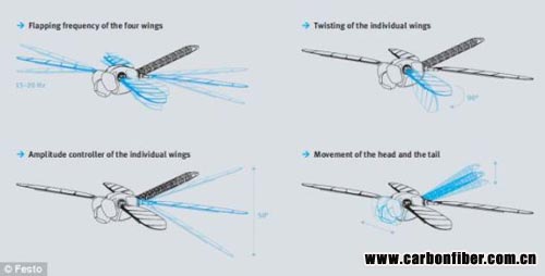 德國費(fèi)斯托公司研制的機(jī)器蜻蜓BionicOpter,翅膀采用碳纖維和箔材料,可使用手機(jī)進(jìn)行控制