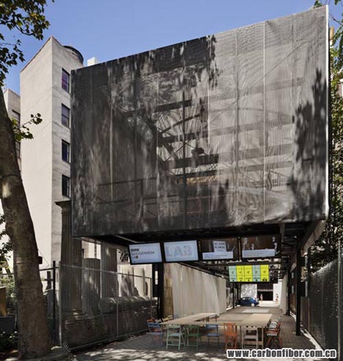 The lower half of the BMW Guggenheim Lab structure is an open space that can be configured to meet the particular needs of the various programs, shifting from a formal lecture setting with a stage to the scene for a celebratory gathering or a workshop. The upper, “toolbox” portion of the structure is loosely wrapped in two layers of semitransparent mesh, which creates a shimmering moiré effect and allows visitors to catch glimpses of the extensive apparatus of “tools” that can be raised or lowered on a rigging system to configure the lower space for the different programs. Remarkably, the BMW Guggenheim Lab is the first building designed with a structural framework composed of carbon fiber. Videos and images of the structure and the construction process can be viewed at youtube.com/bmwguggenheimlab and flickr.com/bmwguggenheimlab.