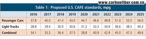 在美國,國家公路交通安全管理部門(簡稱“NHTSA”)和環境保護機構(簡稱“EPA”)正在對“公司平均燃油經濟(簡稱 ‘CAFE’)標準”進行修訂,修訂后的標準將在2017~2025年間執行。CAFE標準是美國政府針對所有被售賣到美國的轎車和卡車而設立的汽車燃油效率標準。這一被提議的“2017~2025標準”,要求汽車的燃油效率要有大幅度的提升。