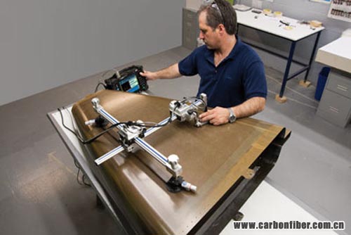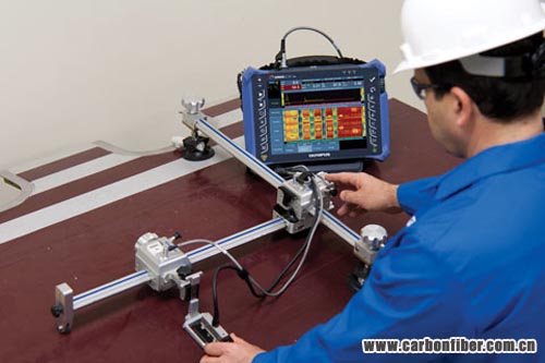 在維護檢測過程中,可以很快探測到某些典型的缺陷,如:脫膠缺陷、嵌入材料補修區域中的夾雜物等。此外,在制造業環境中,可以方便地使用CFRP解決方案,檢測出關鍵性的分層和多孔性缺陷。這個解決方案可在生產過程中對較大的材料表面,或維護過程中修理后的工件,進行完整的半自動成像操作。還可以用于對較小工件或難于接觸到的區域,進行手動檢測。