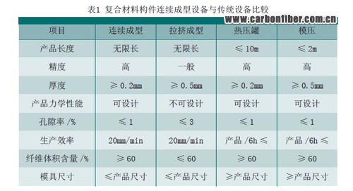 復合材料連續成型設備與傳統成型設備的比較見表1。連續成型設備不受場地和模具的限制,可在小型模具上通過連續固化成型生產大型、超長復合材料構件。另外,該設備可通過成型前的自動裁剪-鋪疊系統,實現具有鋪層設計的復合材料構件的連續生產,這與傳統的拉擠設備不同,同時可控制復合材料構件的纖維體積含量。