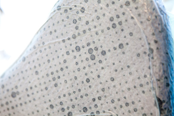 For the medium cure epoxy selected, pot life ranged from 20-25 minutes. This was not much time to get all laminate layers wet and laid on our foam plug. The back layers were wetted first. We decided the best way to wet the layers was to lay both cloth layers inside an oversized vacuum bag and to place resin in between the layers inside the bag. Then the resin was spread throughout the cloth from the outside of the vacuum bag using the plastic squeegee. Once the cloth was fully wetted, it was immediately removed from the bag and placed on the foam.