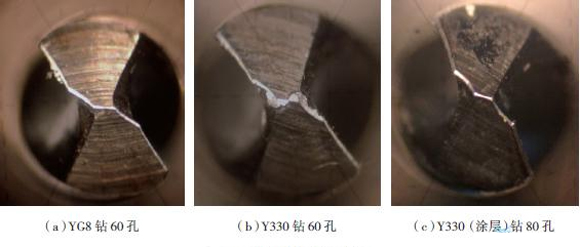 圖9為鉆削一定數量孔后3種鉆頭的磨損情況。從圖中可以看出,鉆削60孔后,Y330鉆頭磨損比較嚴重,YG8磨損量相對小些,Y330(涂層)鉆頭雖然所鉆孔數比較多(80孔),但磨損最小。