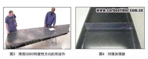 熱塑性復(fù)合材料主結(jié)構(gòu)件是一個(gè)過去即有涉獵的領(lǐng)域。灣流G550和G650 飛機(jī)的壓力艙壁板(圖2)是一系列帶壓力成型加強(qiáng)肋的碳/聚醚酰亞胺。空客A400M 的駕駛艙地板就是用熱塑性復(fù)合材料制造的。最近,已經(jīng)著手焊接主操縱面。新型灣流G650 公務(wù)機(jī)(JEC2010 創(chuàng)新獎(jiǎng)得主)的方向舵和升降舵就是感應(yīng)焊接的多肋扭力盒結(jié)構(gòu)(圖3)。