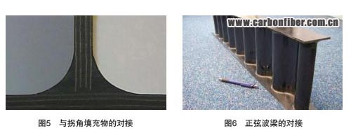 2003 年,一種碳/ 聚醚醚酮單向帶(Cytec)制成的客機(jī)地板梁得到發(fā)展。這種可高效制造產(chǎn)品很適合航空業(yè),因此,緯線鋪放(pick & place)被選作腹板和緣條的預(yù)成型體成型方法。所有這些元件都在共固結(jié)的過程中被熔合在一起。在研發(fā)工字梁組合件的過程中,曾經(jīng)尋求一種可簡(jiǎn)化制造大量加強(qiáng)肋的方法。該方法是“對(duì)接”1 塊平層壓板,將其與普通工字梁共固結(jié)在一起(圖4)。這被證明是一個(gè)有效的解決方案。在制造上比最初設(shè)計(jì)的壓力成型加強(qiáng)肋的方法簡(jiǎn)單得多。對(duì)接強(qiáng)度采用注射成型,增加了坡口圓角半徑,得到了優(yōu)化(圖5)。