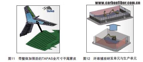 雙曲面、7m 長(zhǎng)的扭力盒是作為TAPAS 項(xiàng)目的一部分開發(fā)的,將于2011 年制造并驗(yàn)證完畢。該產(chǎn)品是對(duì)灣流G650 平尾中段重新設(shè)計(jì)的產(chǎn)物(圖11),其蒙皮的特點(diǎn)是整體對(duì)接T 形加強(qiáng)筋。研究還在繼續(xù),以便確定熱壓罐外成型是否可行。纖維鋪放因其在鋪疊過程中對(duì)材料的浪費(fèi)最少而成為首選的鋪疊技術(shù)。蒙皮鋪疊將采用專業(yè)化的纖維鋪放設(shè)備單元。該設(shè)備單元將安裝GTech的Vericut 復(fù)合材料程序模塊,以便將CATIA 設(shè)計(jì)與機(jī)械手軟件鏈接起來。該設(shè)備單元只需少量投資即可開發(fā),滿足成批量生產(chǎn)12m 全尺寸蒙皮壁板的需求(圖12)。