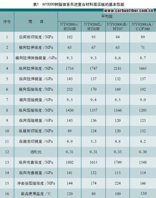 為提高和穩(wěn)定先進(jìn)復(fù)合材料的成型質(zhì)量,降低先進(jìn)復(fù)合材料的制造成本,我們根據(jù)不同的復(fù)合材料結(jié)構(gòu)件研制開(kāi)發(fā)了中高溫度固化、韌性不同的NY9200環(huán)氧樹(shù)脂體 系,原材料均為國(guó)產(chǎn),價(jià)廉易購(gòu);其配制工藝簡(jiǎn)單,質(zhì)量穩(wěn)定,可用于濕法或干法預(yù)浸,無(wú)污染,易工程化;其預(yù)浸料具有貯存期長(zhǎng),固化溫度帶寬,固化時(shí)間短等 優(yōu)點(diǎn);其先進(jìn)復(fù)合材料具有韌性和機(jī)械性能兼優(yōu)的特