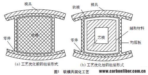 針對(duì)上述問(wèn)題,我們經(jīng)過(guò)反復(fù)試驗(yàn),在工程化生產(chǎn)中不斷改進(jìn),將軟模共固化工藝優(yōu)化為圖1(b)所示形式,利用這種工藝方案連續(xù)生產(chǎn)300多架份的復(fù)合材料產(chǎn)品,質(zhì)量一直穩(wěn)定。