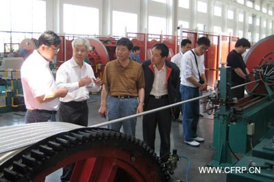 此外,還需要增韌改性,使所制芯棒具有韌性,而不是硬棒。否則不會通過放線滑輪試驗。連續拉擠成型是成熟工藝。但制造碳纖維復合芯棒具有一定的特殊性。簡單的工藝流程是:將碳纖維筒放在整理架上,單向(0°)集束,包覆玻璃纖維,浸漬環氧樹脂膠液,通過鋼制???,以控制直徑,然后通過固化爐,固化成型。芯棒直徑可在0.19~19mm范圍內調節,拉擠速度可在2.7-18m/min范圍內調節。
