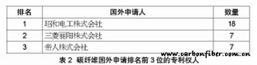 與之相反的是,國(guó)外申請(qǐng)人中位于前三位的均為日本企業(yè),大型纖維、化工企業(yè)是碳纖維研究進(jìn)展的主導(dǎo)力量。目前,在碳纖維領(lǐng)域,日本企業(yè)占有市場(chǎng)份額最大,關(guān)鍵技術(shù)主要掌握在東麗公司、東邦Tenax集團(tuán)和三菱人造絲集團(tuán)手中,其他碳纖維企業(yè)多處于成長(zhǎng)階段,生產(chǎn)工藝正在摸索中不斷完善。從專利申請(qǐng)數(shù)量上看,以昭和電工株式會(huì)社最多(Showa Denko)(見表2)。