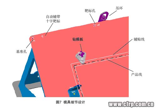 (4) 靶標孔:用于手動鋪貼時放置激光投影的靶標,以定位鋪層區域。靶標孔按實測值即可,坐標值刻于模具上。