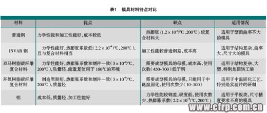 用作復合材料成型模具的材料主要有普通鋼、INVAR鋼、復合材料(雙馬和環氧樹脂)、鋁等。通常根據材料的性能(主要是高溫下的熱膨脹系數)、成本、周期及使用次數來選擇,見表1。