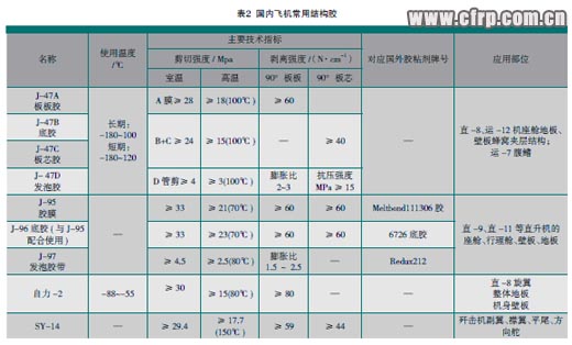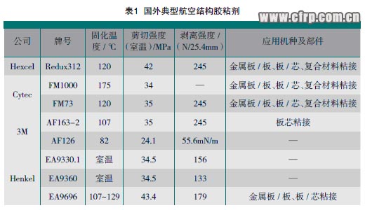 表1、表2分別列出幾種典型國內外復合材料膠粘劑及其基本性能。