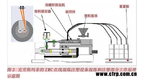 克勞斯瑪菲公司開發的在線配混注塑成型設備(其工作原理如圖3所示)為LFT工藝的實現提供了一種新的方法。該設備將雙螺桿混煉機和克勞斯瑪菲的標準MC塑料注塑機組合,實現了原料在線直接混煉。這種混煉-注塑方法具有更多優勢: