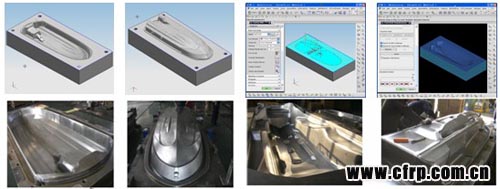 如圖3所示為對該艇身smc模壓成型的模具設計、模具數控加工編程以及模具實物。該模具結構為封閉式、油循環加熱成型艇身。此種結構較開放式、電加熱型模具,其產品重量可以嚴格控制、無飛邊、壁厚一致性好、加熱均勻、維修維護方便、模壓能耗低等多種優點。模具設計最主要的為凸凹模凸凹模之間的接口配合設計對溢料飛邊的影響、加熱系統的設計、頂出機構與模具的表面光潔度與修配余量的控制。
