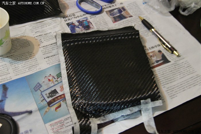 然后展開碳纖維布,把要包裹的零件放上面,確定好用多少布料之后,用美紋紙標記出來,貼美紋紙的目的其實是防止碳纖維布在裁剪的時候碎屑亂飛,這個很重要,否則的話,有你收拾的,并且碳纖維布的纖維特別細小,沾到皮膚上會很癢,但是你還看不到纖維,這會很郁悶的。。。 123456