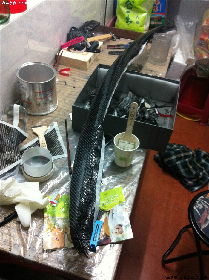 “車禍現場”兄弟,請看下面的幾個照片,尾翼制作過程中,包的雙層碳纖維,樹脂要刷好幾遍呢,這是第二層的第二遍,預計還要一周時間。